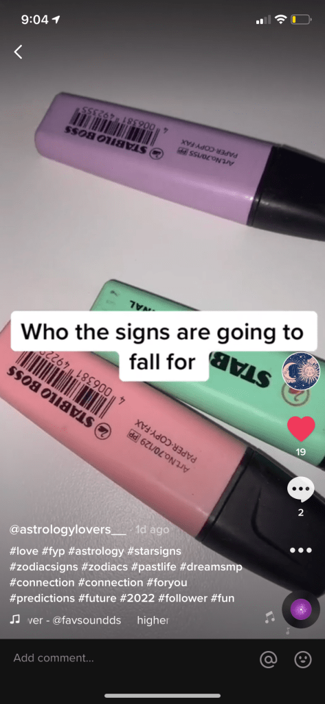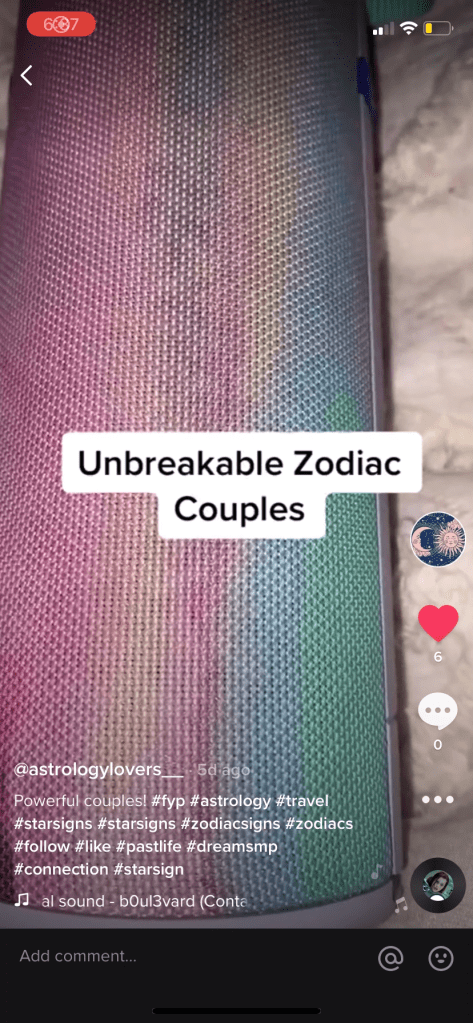 For my Digital Artefact, I focused on something that I am personally really invested on and love spending time researching about it, which is astrology. Basically, I created a Tik Tok page where I have posted various videos that include fun things like: compatibility between the star signs, zodiac mood boards, where the zodiacs are most likely to travel, the zodiac’s 2022 predictions and more.