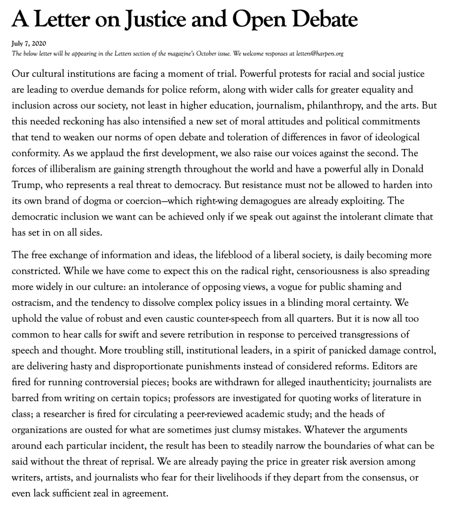 In the letter it highlights when cancel culture is appropriate for usage which involves when the statement is; “morally wrongful, gravely offensive…can lead to worrying consequence for an individual…”