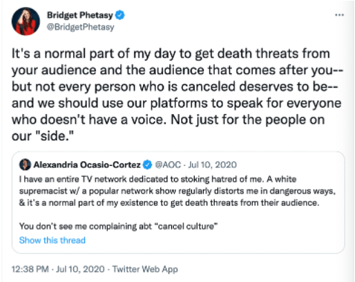 However, other reasoning behind cancelling someone from something they shared that doesn’t include the judgements, is when cancel culture is considered harsh and impacts freedom of speech. Death threats can also be resulted from cancel culture, which is when it becomes serious.