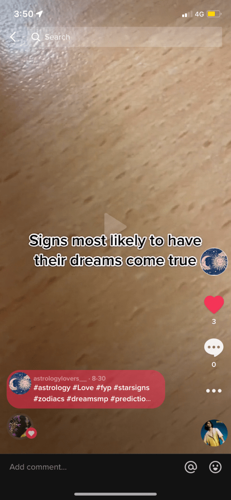 This website, https://izea.com/resources/astrology-influencers-tiktok/ highlights the seven current most popular astrology tik tokers. I came to realise that although some were factual and insightful, the majority were still personas trying to come across humorous whilst utilising astrology as the topic.