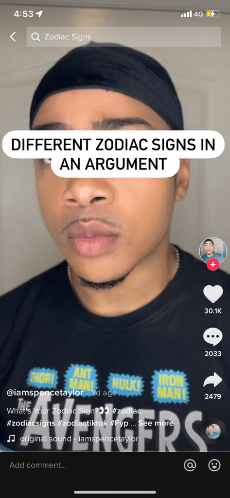 I had conducted some web searching and came across a website that was on the seven current most popular astrology tik tokers. I came to realise that although some were factual and insightful, the majority were still personas trying to come across humorous whilst utilising astrology as the topic.