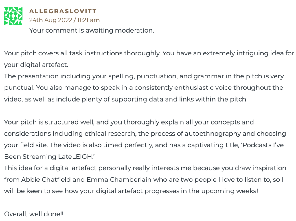 Another step conducted during the creation of my digital artefact and also helped me prompt my key autoethnographic epiphanies were by, commenting on other people’s pitches and providing them with feedback. I talked more about this in my blog post 3. This step in the process really made me reflect on my own digital artefact idea and the media niche I had chosen, and ultimately gained a better understanding in the areas where I could have some room for improvement.