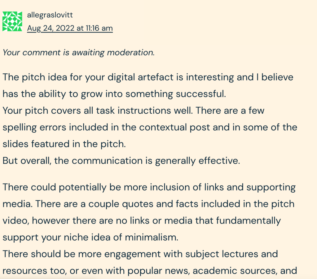 After commenting on a few other people’s pitches, due to their very different ideas and concepts for their media niche, it meant I had to help critique their work using different techniques to match their concepts. This allowed me to practice adapting to multiple possible ideas, and I use this to help think of what I could personally also do better in my own digital artefact (which also was very different from the three ideas I commented on.)