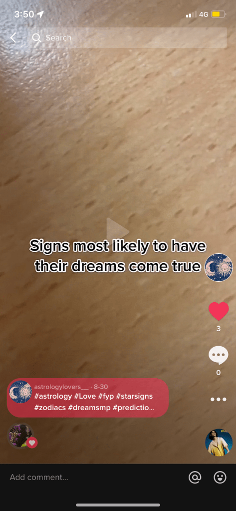 Whenever I wake up in the morning, I find myself scrolling on Tik Tok. It could be any time of the day and I might be with friends or even alone and decide to make a Tik Tok just because. The majority of my Tik Tok videos are on astrology and I can honestly spend hours watching them.