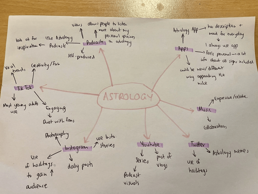 Astrology is active across many platforms which is why my mind map was full of complex potential ideas and perceptions. My mind map featured branches that lead to the main sub heading which included other media platforms astrology is displayed on. The little notes surrounding the subheadings were my ideas and thoughts that came with that particular media platform and how I thought they interact differently to each other (what might one platform have that the other doesn’t).